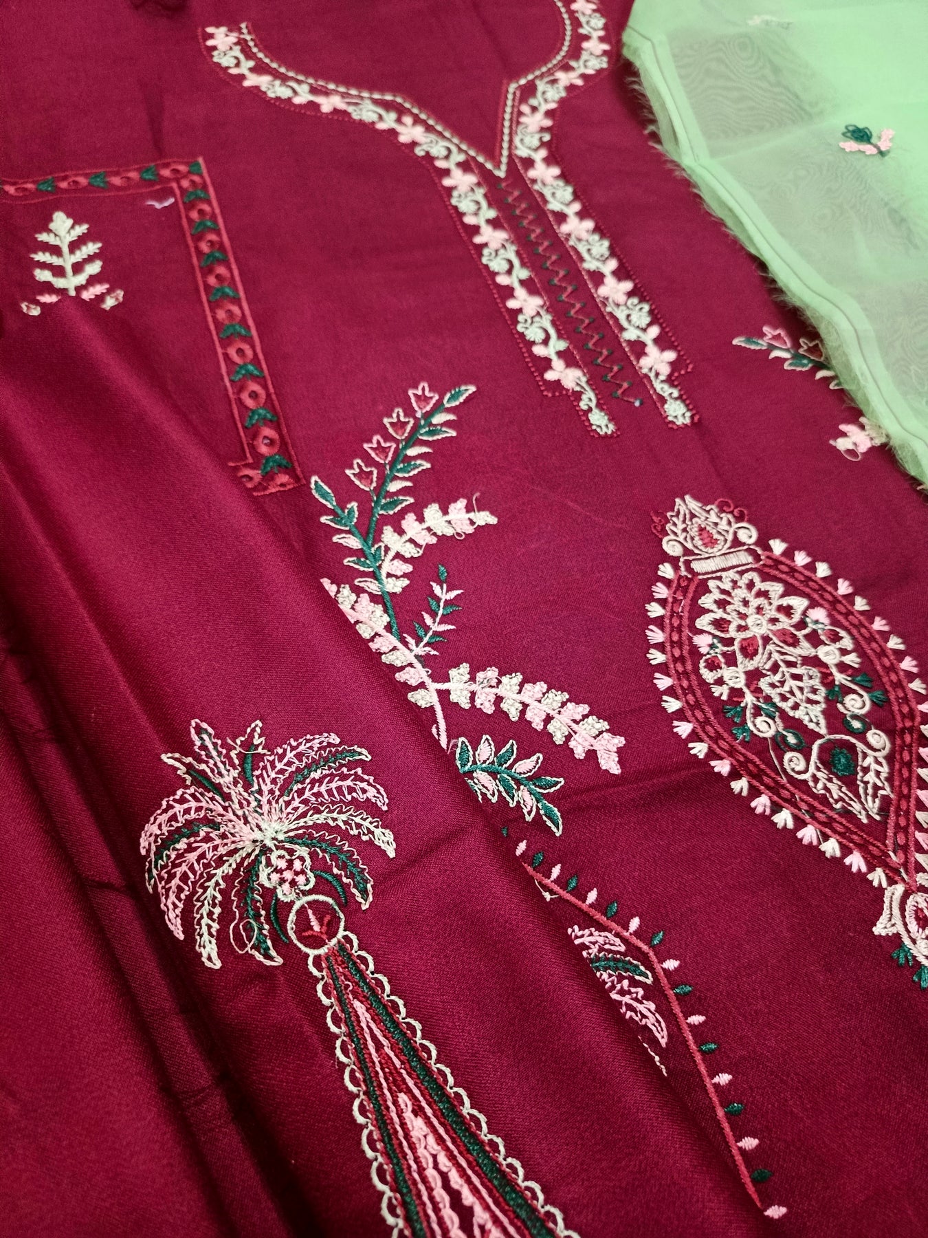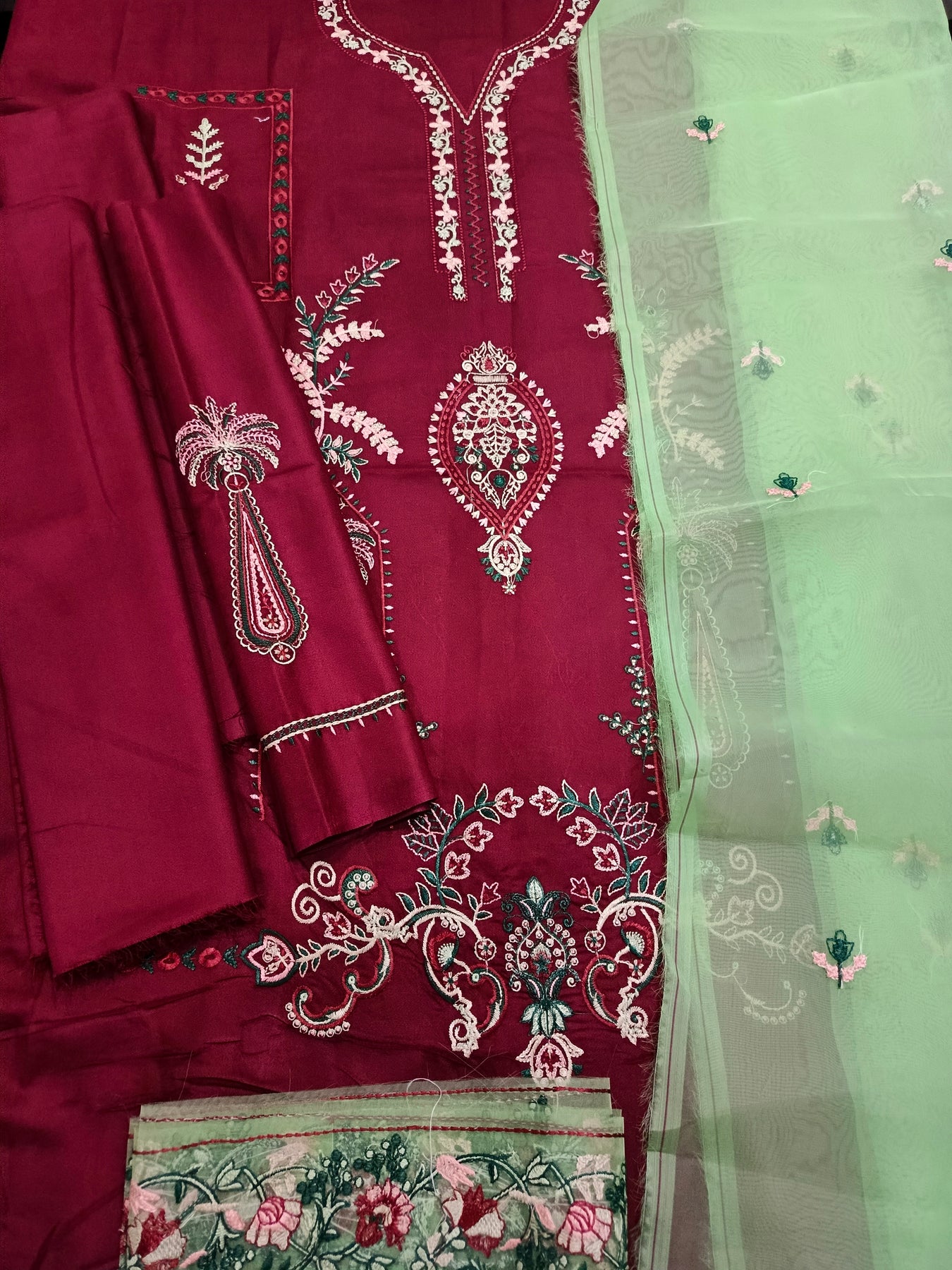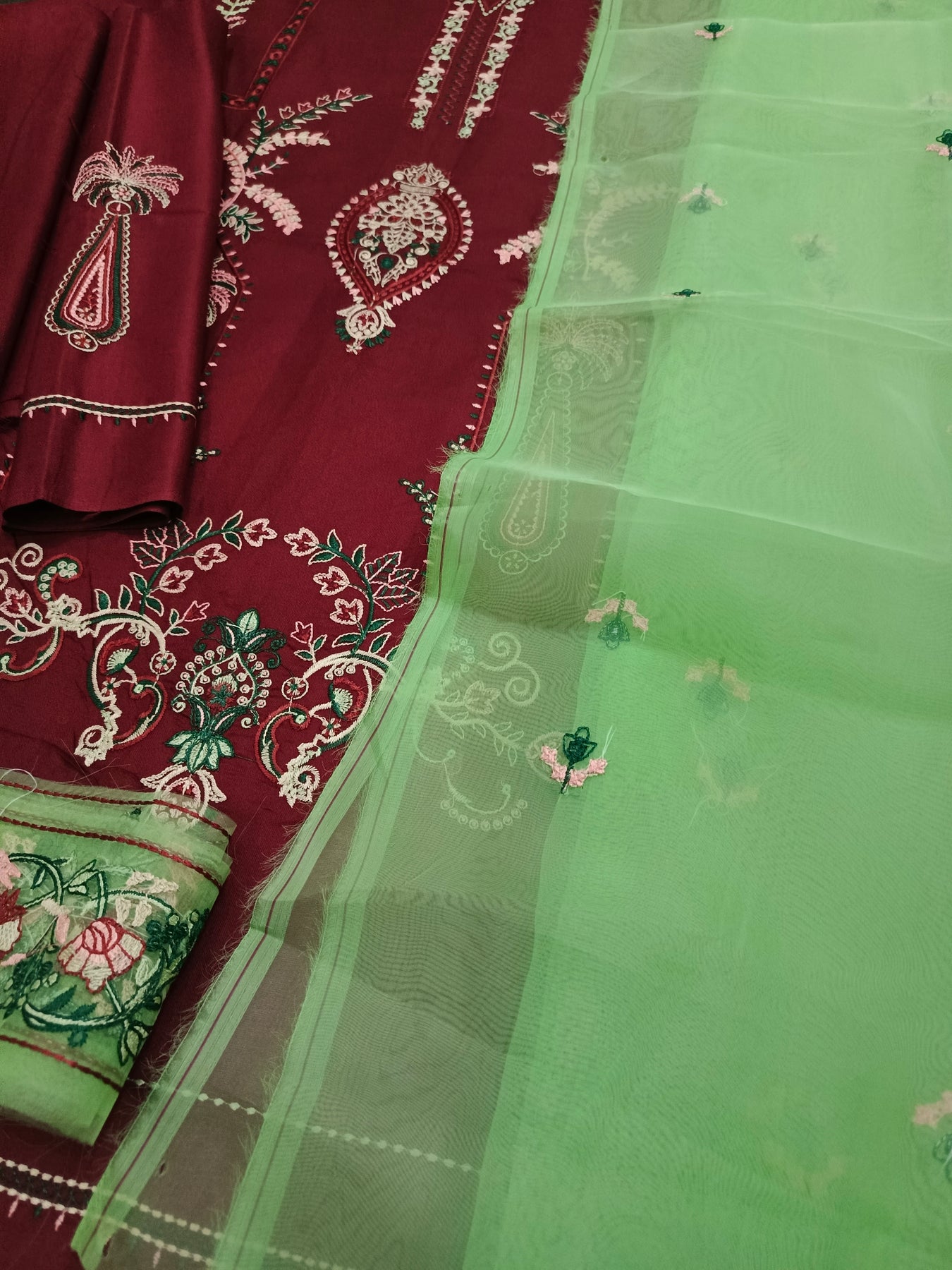 Maroon Dhanak Embroidered 3-Piece Suit with Organza Dupatta