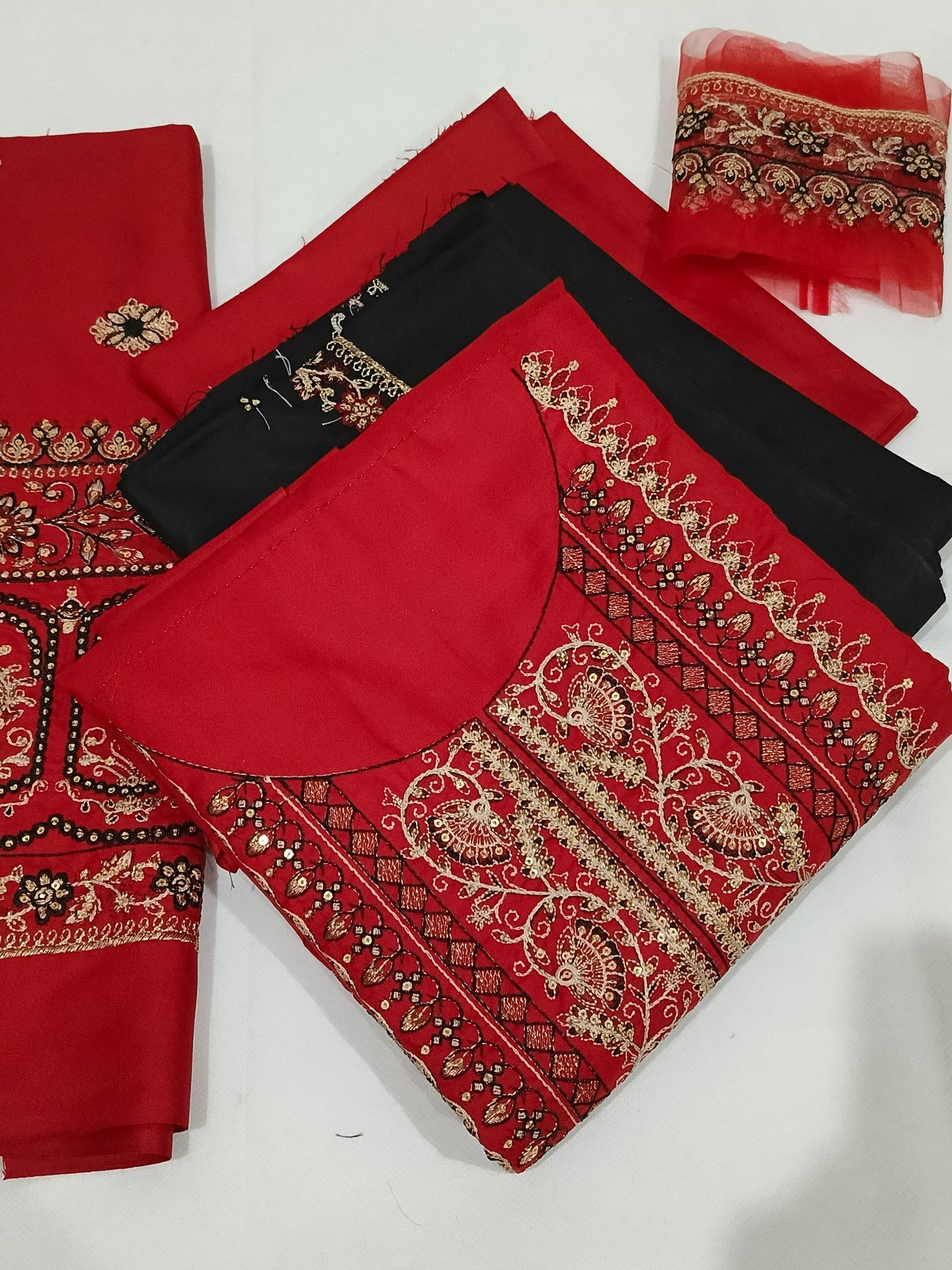DHANAK 3pcFRONT FULLY EMBROIDEREDHEAVY NECK SEQUENCE EMBROIDEREDSEQUENCE EMBROIDERED SLEEVES PLAIN TROUSER EMBROIDERED DHANAK SHAW