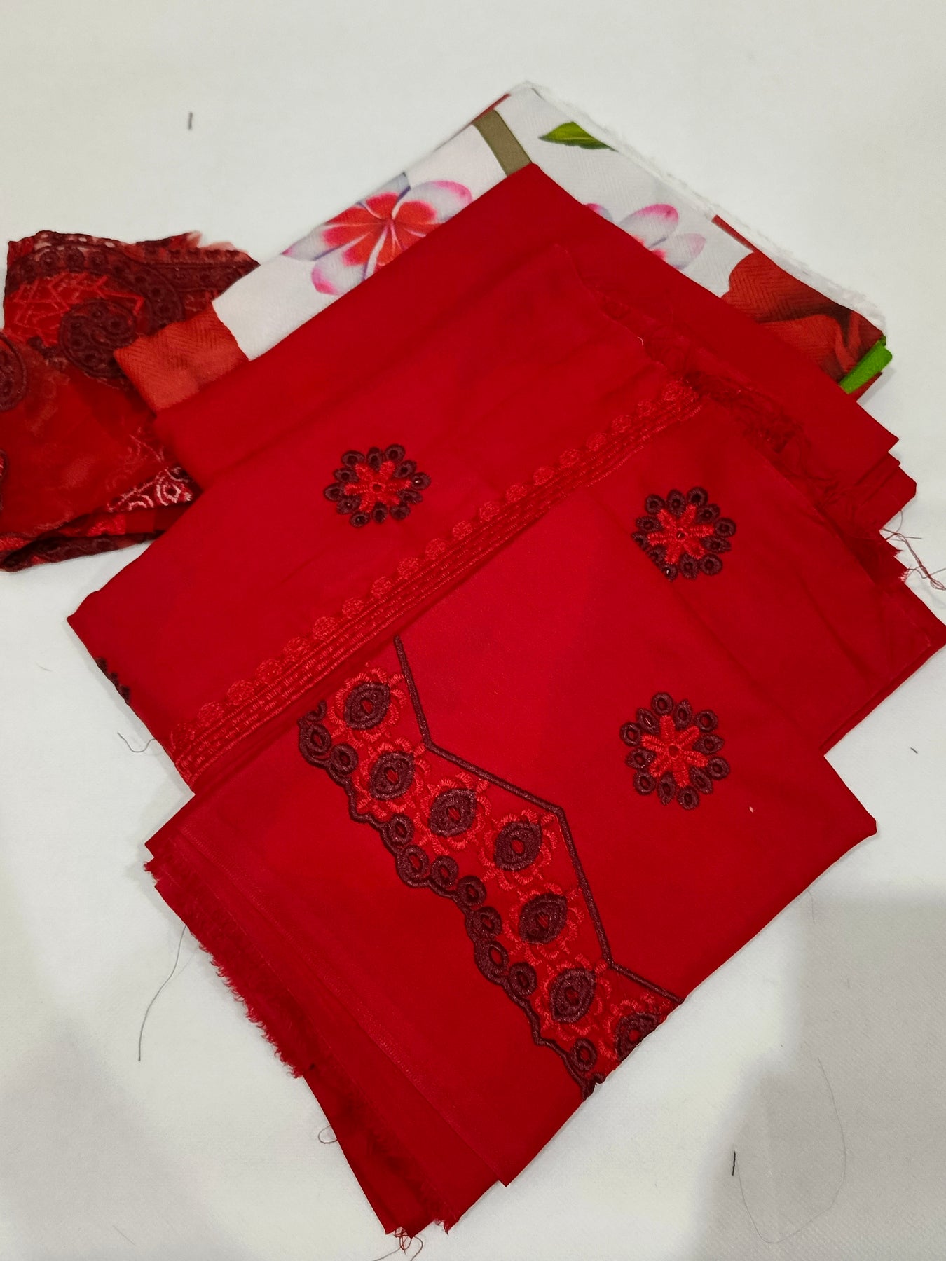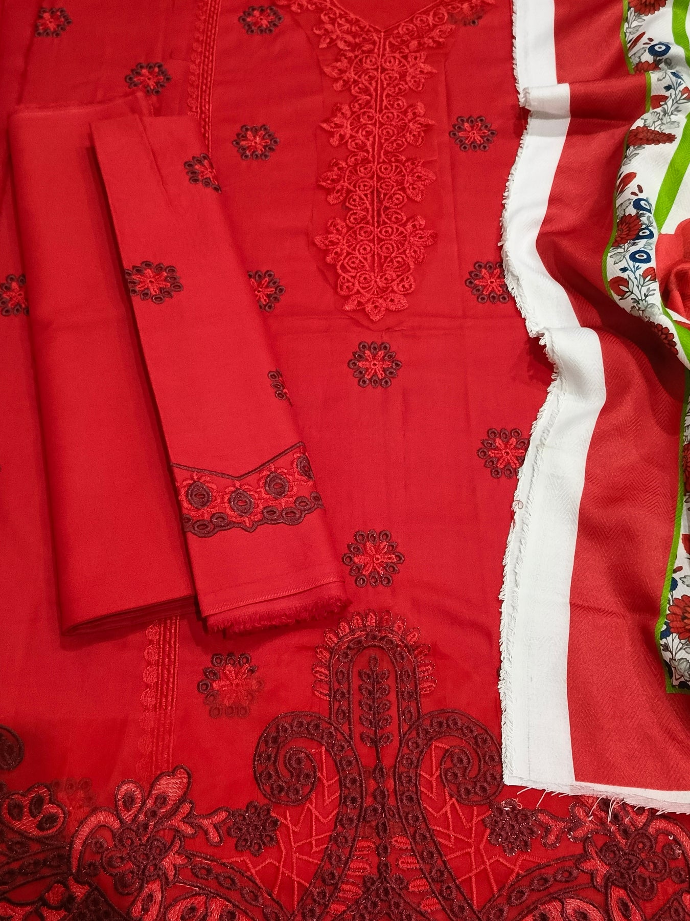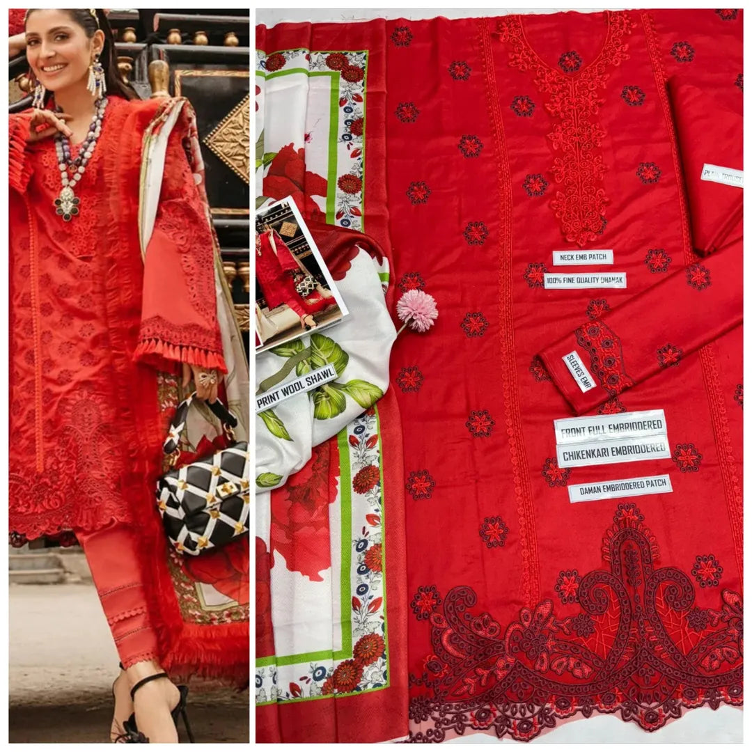 DHANAK 3pcFRONT FULLY EMBROIDEREDORGANZA PATCHESEMBROIDERED SLEEVES PLAIN TROUSER PRINTED DHANAK SHAW
