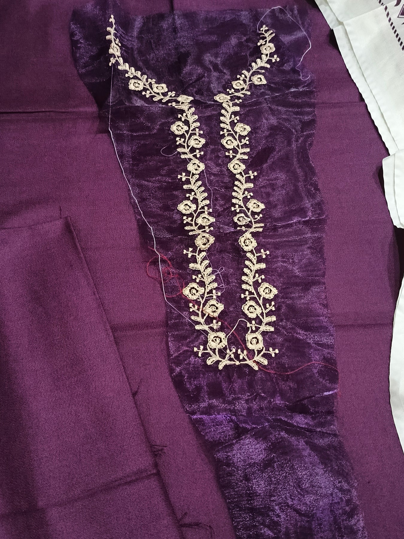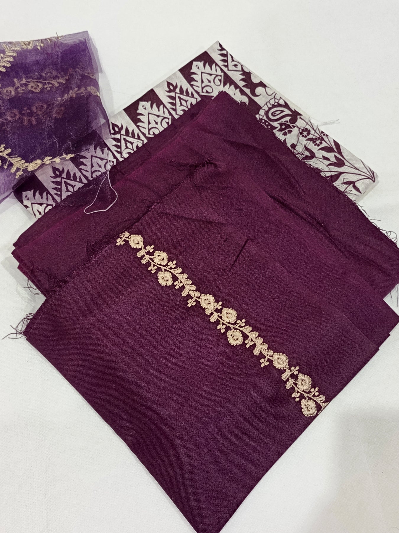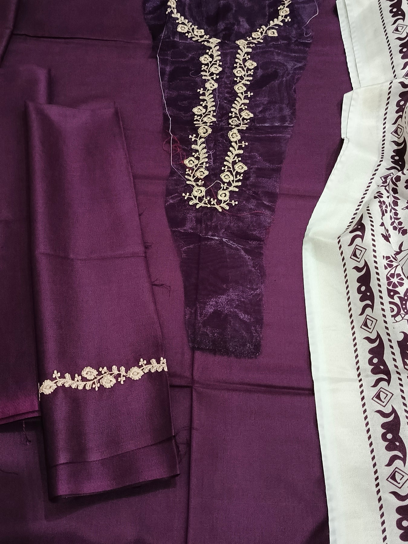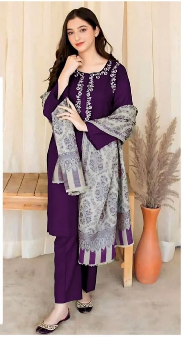 DHANAK 3PcFRONT NECKLINE PATCHEMBROIDERED SLEEVESPLAIN TROUSERPrinted Wool Shawl