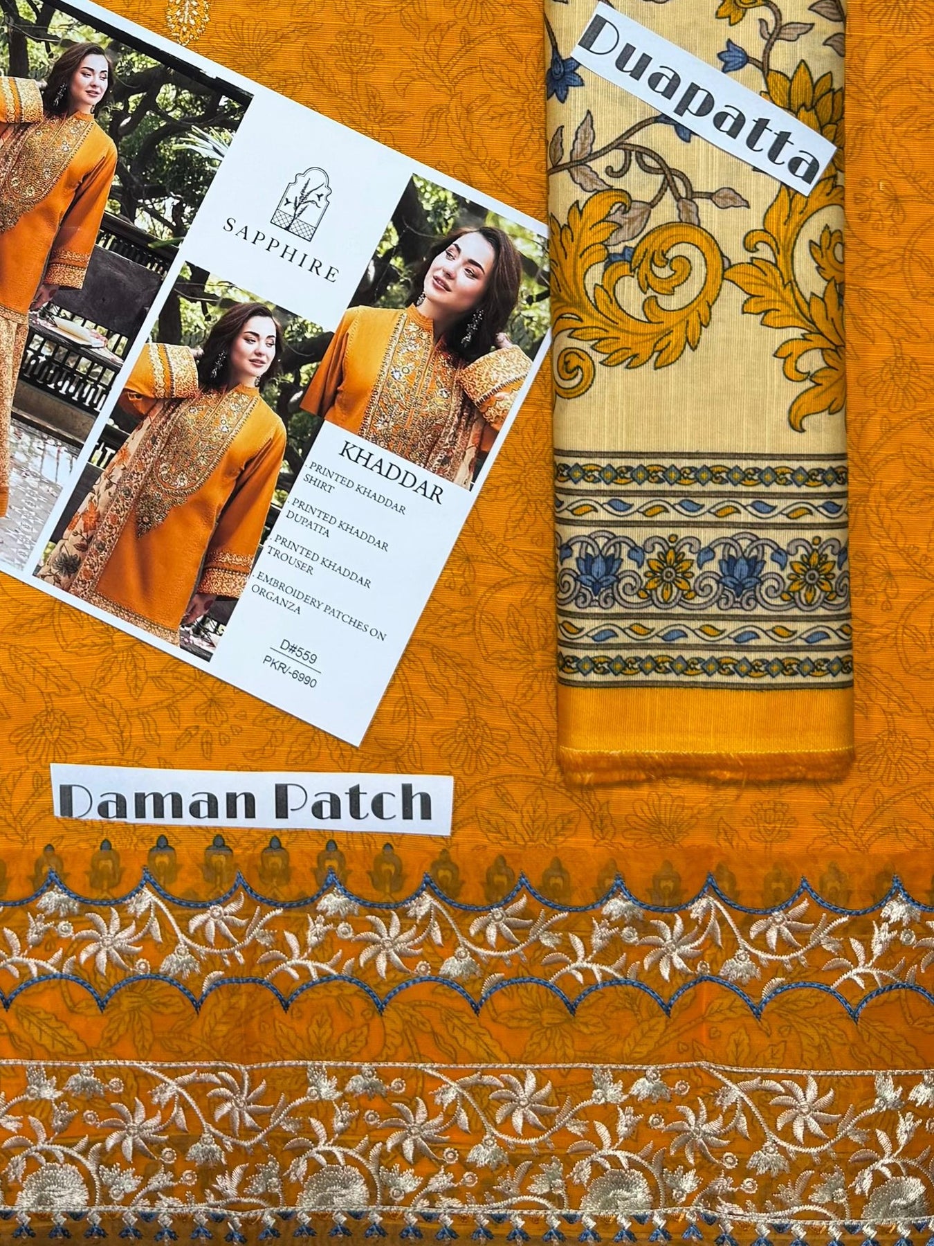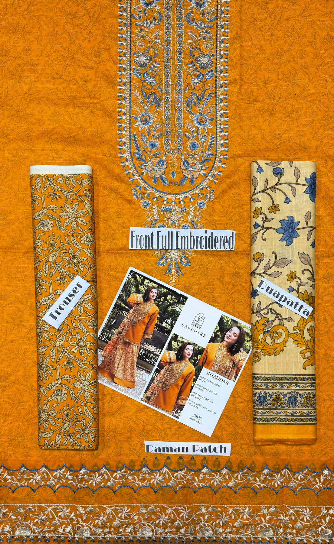 Front Neck Heavy Embroidery Printed Khaddar Dupatta Printed Khaddar Trouser Daman with Heavy Embroidery Patch